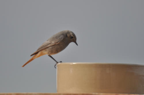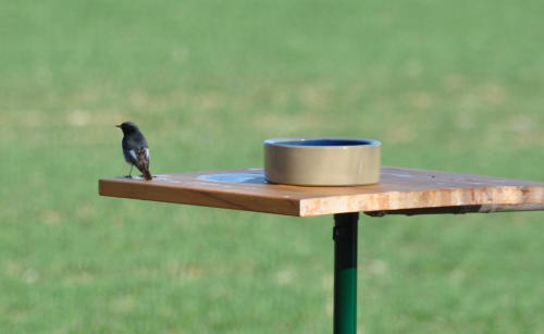 Bei regem Katzenverkehr empfiehlt sich eine katzensichere Vogeltränke. For the small and for the larger one...Hier sieht man unseren Hausrotschwanz (Phoenicurus ochruros), oben das Männchen, unten das Weibchen. Der Rotschwanz trinkt hier nicht nur, sondern benutzt die Plattform auch als Jagdansitz