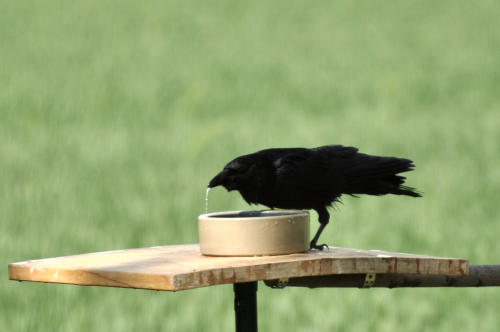 Die Größeren... haben es etwas schwerer. Zwar hat die Plattform auch seitlich eine Landestange, aber wer schwer ist, bringt die Plattform zum schwingen. Der erste Landeanflug der Krähe war somit eine sehr lustige Sache. Das Wasser aus dem Wassernapf ergoß sich in einer Fontäne auf ihr. Aber gerade bei Trockenheit trinkt sie mittlerweile täglich bei uns. Jäger und Gejagte, sie dürfen hier alle ran ans Wasser.